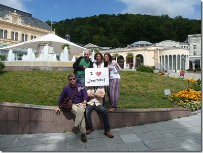 Este verano os traigo dos ediciones, dos, de Reporteros ¡Jindetrés, sal!; esta primera entrega es una mera excusa para apuntarse un tanto en el historial de Reporteros, pues las vicisitudes y anécdotas que me llevaron por estas tierras austríacas fueron relatadas en una anterior serie de entradas (una, dos y tres); pero se quedó fuera la instantánea recogida - tomada por mi compañero de alcoba a tiempo parcial y jefe a tiempo total - en la que aparecen además del menda (en el centro, luciendo cuerpo que no cabeza) y de izquierda a derecha: El Fabuloso Trypman, Pablo El Diablo, Ana La Portuguesa (creadora de la flamante bandera, con ayuda de rotuladores afanados, una barra de labios y un par de gintonics como catalizadores) y Miriambrú (que no se fue a la guerra). Al fondo, el glamuroso Casino Baden donde tuvo lugar la reunión científica, al amparo de la bonita colina que rodeaba todo el entorno.